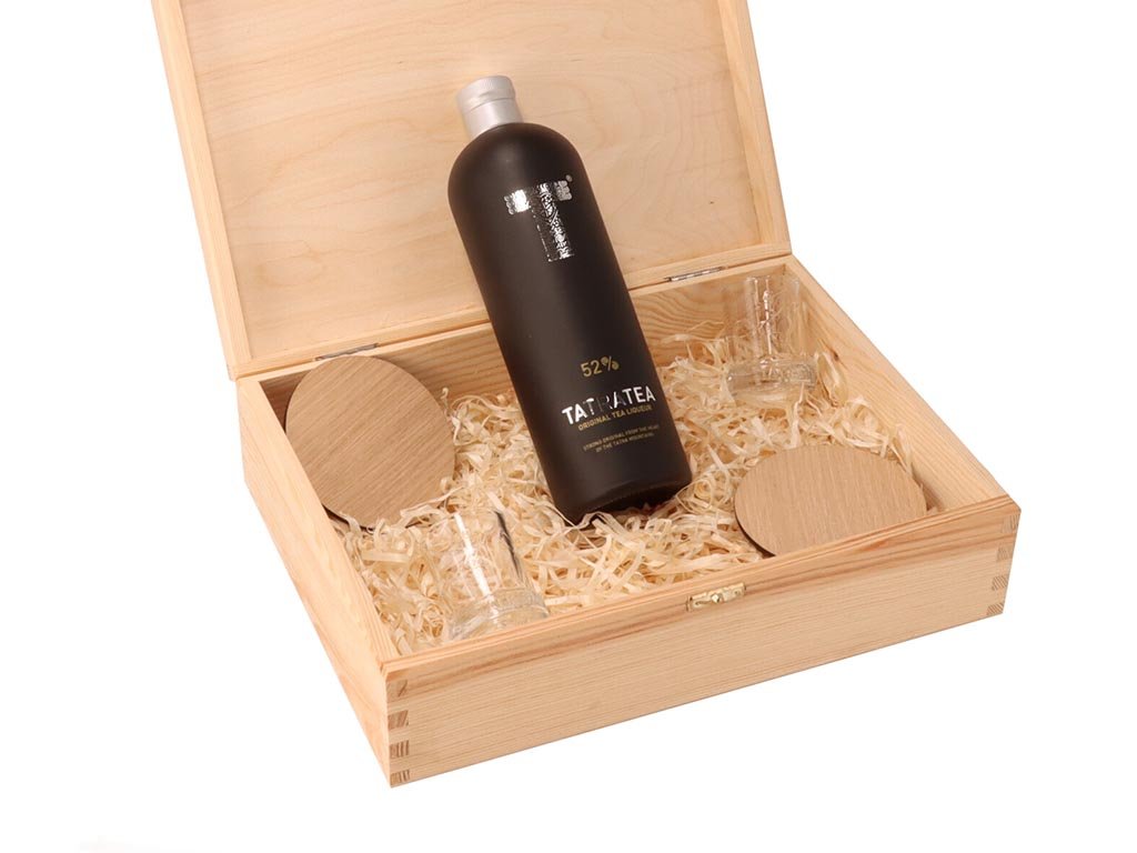 V balení nájdete štýlovú fľašu Tatratea 52% 0,7 l a dva poháre. Drevená krabička je vystlaná presne padnúcou výstelkou, ktorá zaistí nielen bezpečnú prepravu, ale tiež zdôrazní výnimočnosť tohto originálneho darčeka.